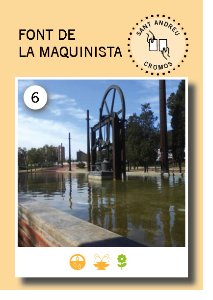 La cara frontal del cromo mostra la fotografia de la Font de la Maquinista i al peu de la imatge hi ha les icones més representatives d’aquest punt que són:
